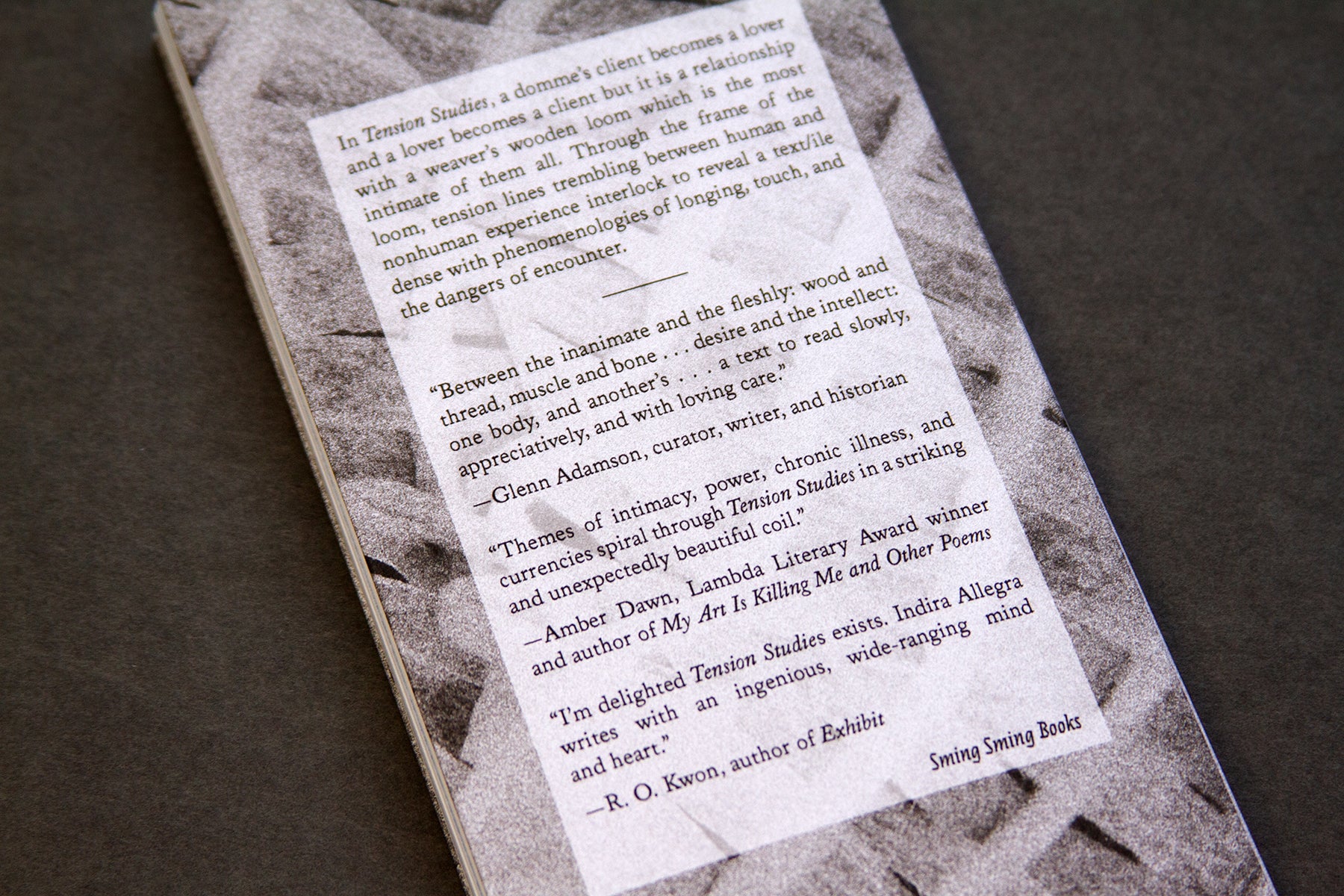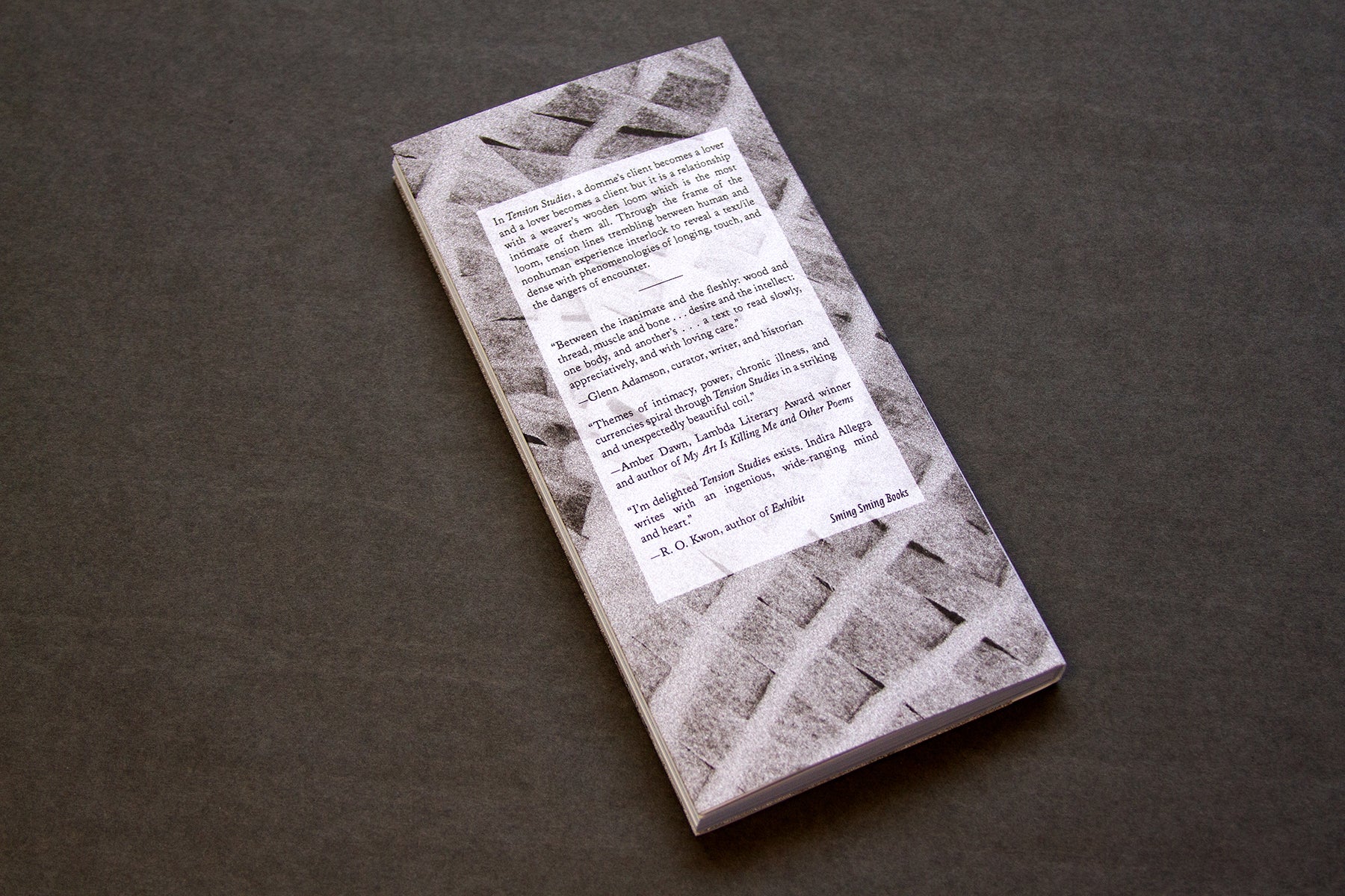 In Tension Studies, a domme's client becomes a lover and a lover becomes a client but it is a relationship with a weaver's wooden loom which is the most intimate of them all. Through the frame of the loom, tension lines trembling between human and nonhuman experience interlock to reveal a text/ile dense with phenomenologies of longing, touch, and the dangers of encounter.